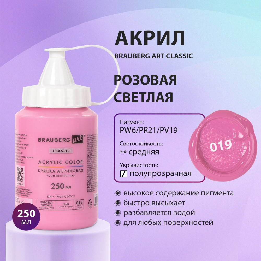 Художественная акриловая краска BRAUBERG ART CLASSIC предназначена для живописи и декоративных работ. Используется при работе почти на любой поверхности: бумаге, картоне, холсте, дереве, коже.