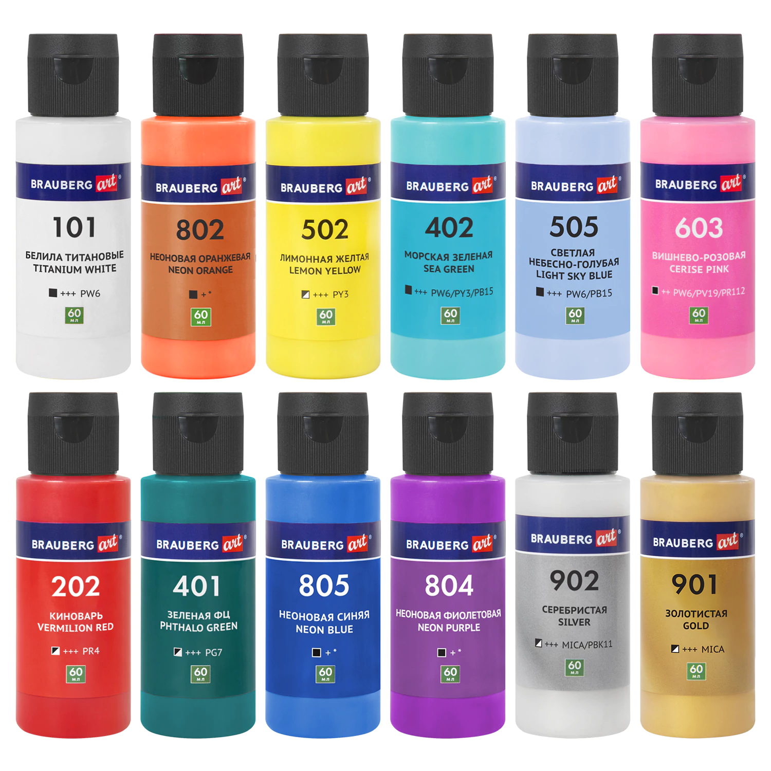 Краски во флаконах объемом 60 мл с удобным дозировочным клапаном поставляются в картонной коробке.