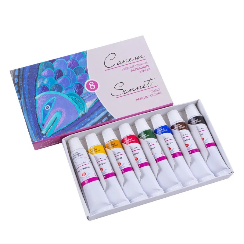 Набор акрила состоит из 8 цветов в тубах по 10 мл: белила титановые, желтая средняя, охра светлая, кармин, зеленая средняя, голубая ФЦ, сажа газовая, умбра жженая. Краски отличаются яркостью и чистотой цвета, прекрасно смешиваются с водой. газовая, умбра жженая.