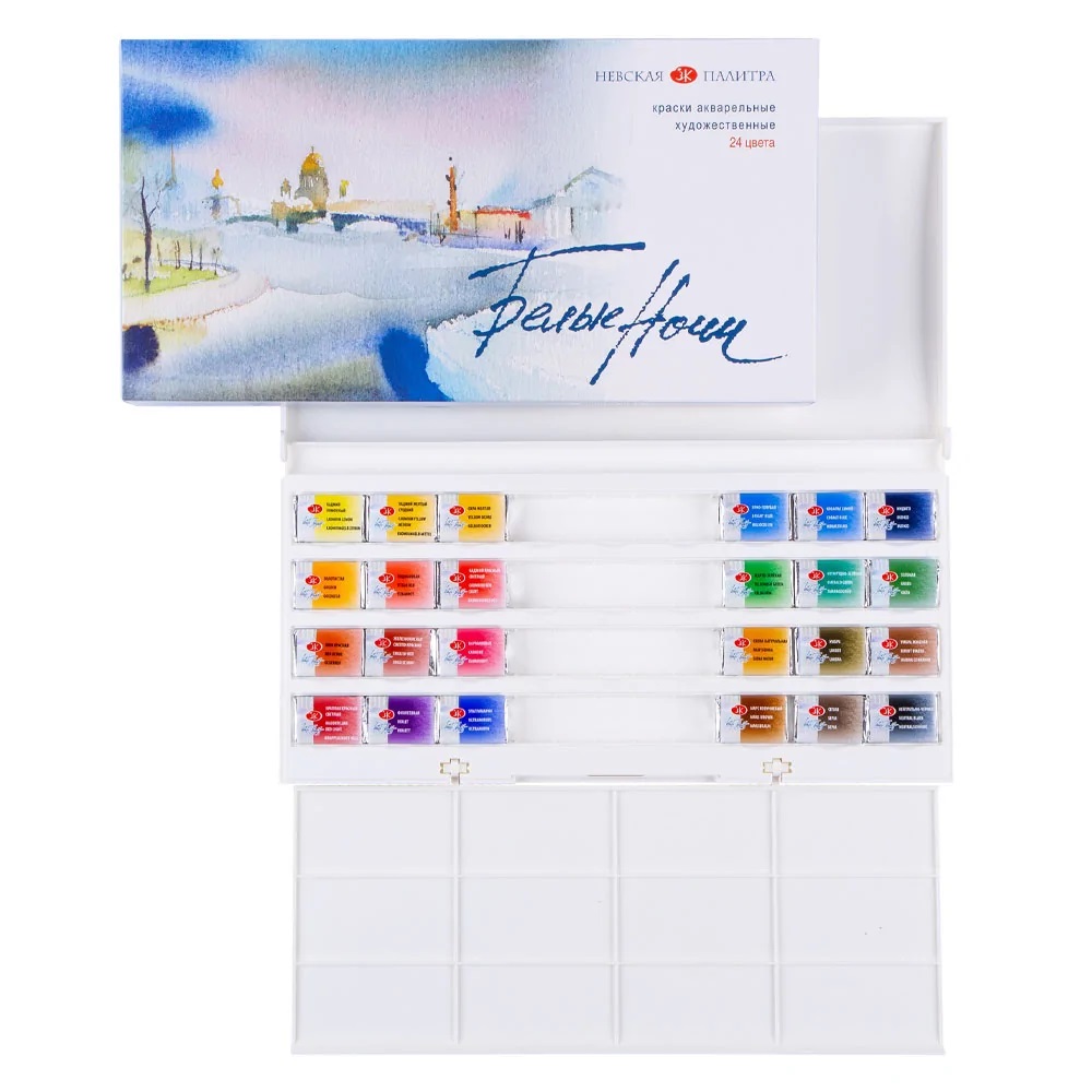 Художественные акварельные краски «Белые ночи» (в кюветах по 2,5 мл.) предназначены для живописи, изготавлены из тонкотертых натуральных пигментов высокой концентрации и связующего из натурального гуммиарабика.Высокая интенсивность цветового тона акварели сохраняется даже при разбавлении большим количеством воды. Акварель обладает свойствами: яркостью и чистотой цвета, высокой светостойкостью, разносимостью и прозрачностью. Акварель «Белые ночи» предлагает сбалансированную палитру, насчитывающую 66 цветов, из которых 46 монопигментные.
