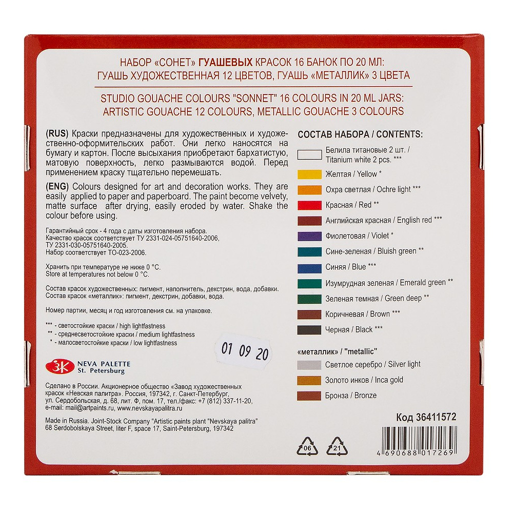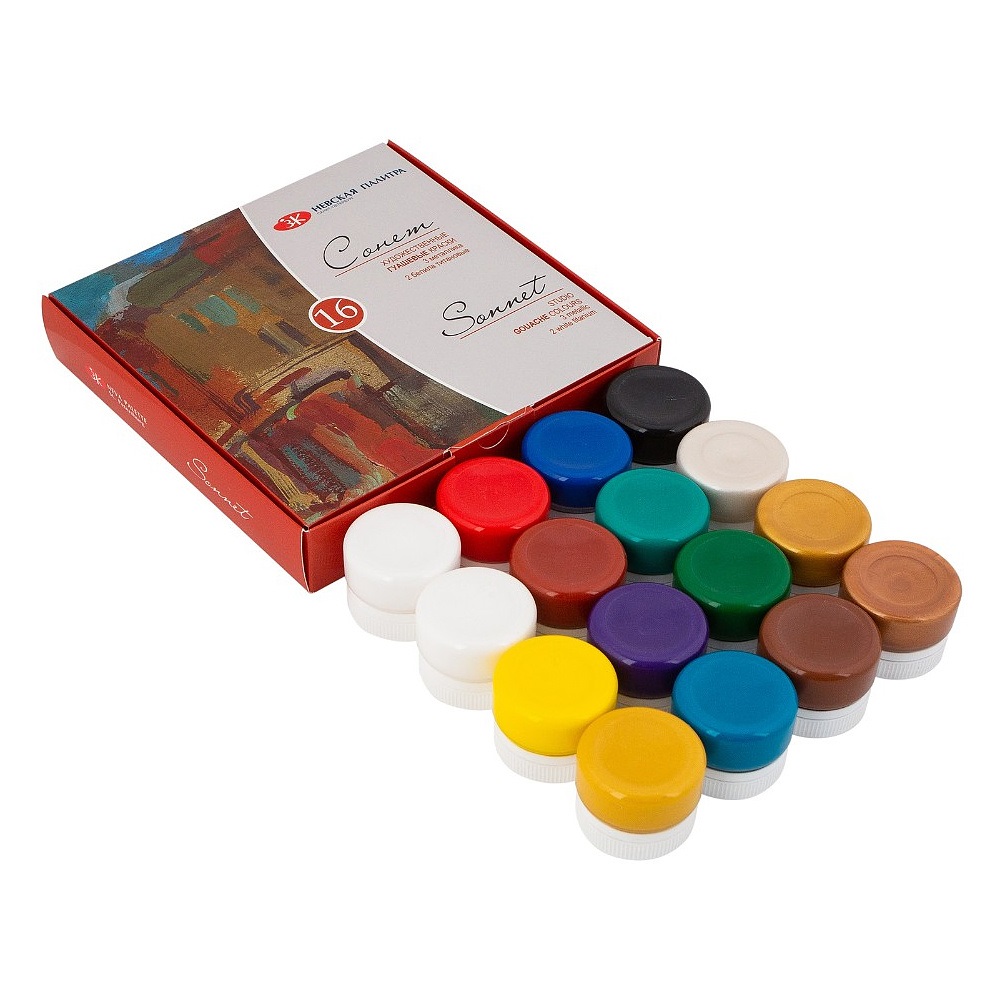 Художественные гуашевые краски серии «Сонет» предназначены для художественных и художественно-оформительских работ. Краски изготовлены по новой технологии, аналогичной производству акриловых красок: в рецептуре использованы пигментные пасты. Краски легко наносятся на бумагу и картон. Краски прекрасно смешиваются между собой и белилами, создавая новые чистые цвета. После высыхания приобретают бархатистую, матовую поверхность, легко размываются водой. Могут использоваться в художественном образовании.