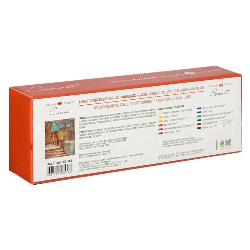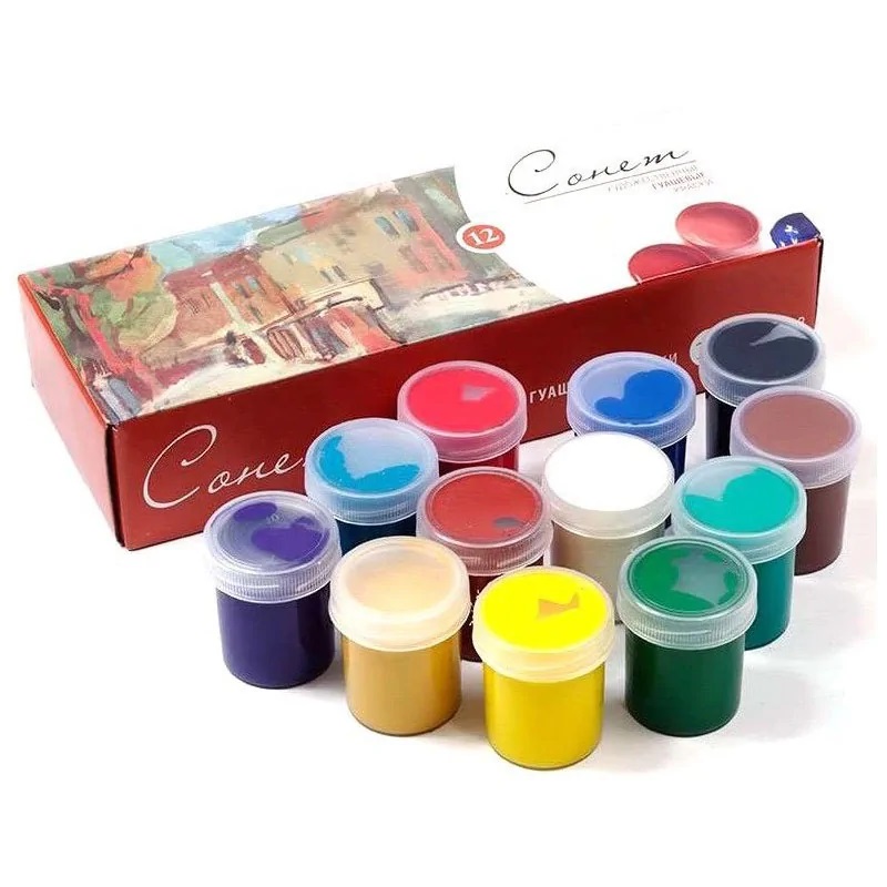 В набор художественных гуашевых красок входит 12 цветов по 40 мл. В составе гуаши используются пигментные пасты и синтетическое связующее.