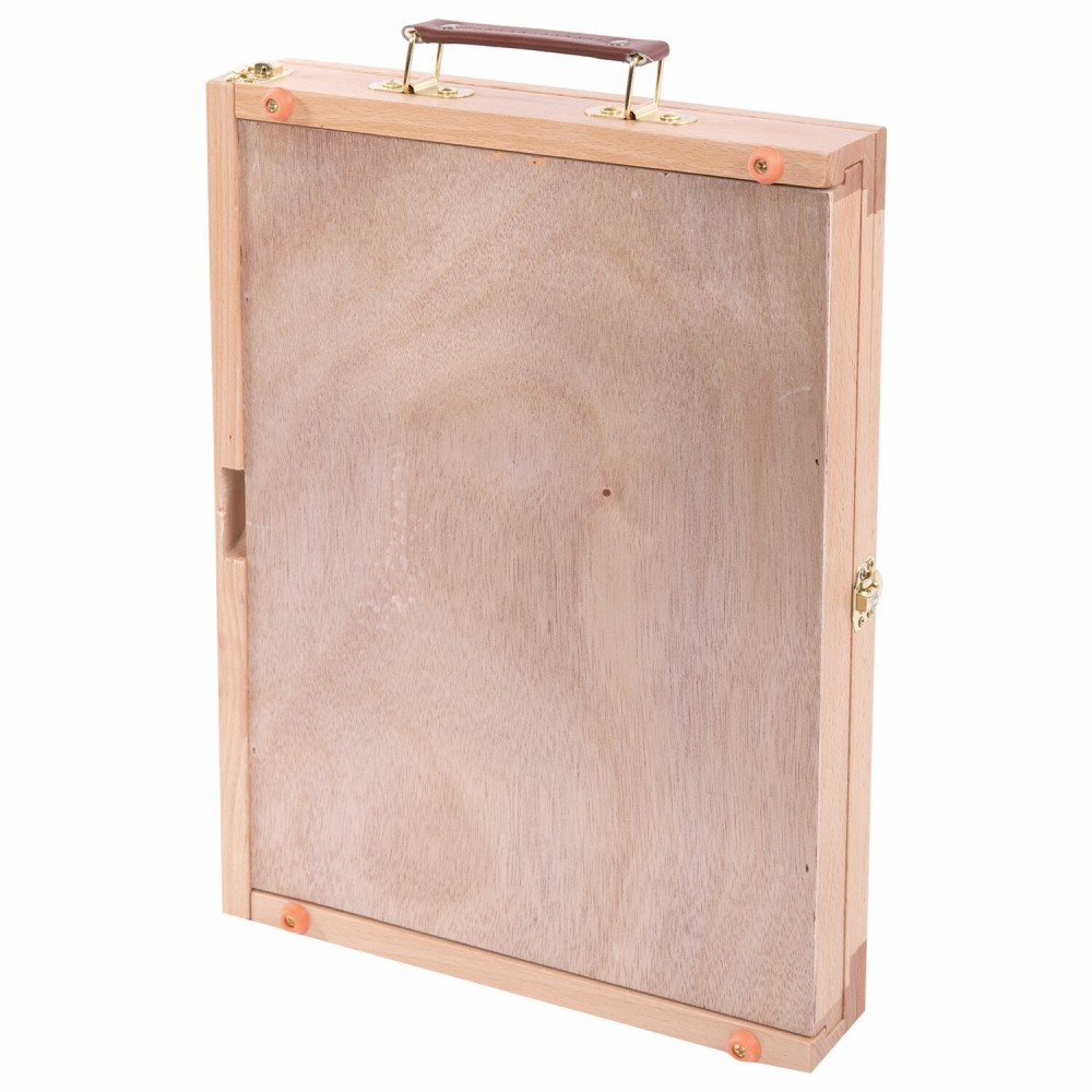 Мольберт с выдвижным ящиком изготовлен из натурального бука, пропитанного маслом. Мольберт настольный прост в установке. В комплект входит деревянная палитра. На мольберте можно закрепить планшет с бумагой, а в ящике хранить кисти, краски, пастель или другие инструменты. Угол наклона регулируется. Для удобной переноски имеется ручка. Максимальная высота размещаемого холста – 30 см. Подходит для различных видов холста и бумаги.