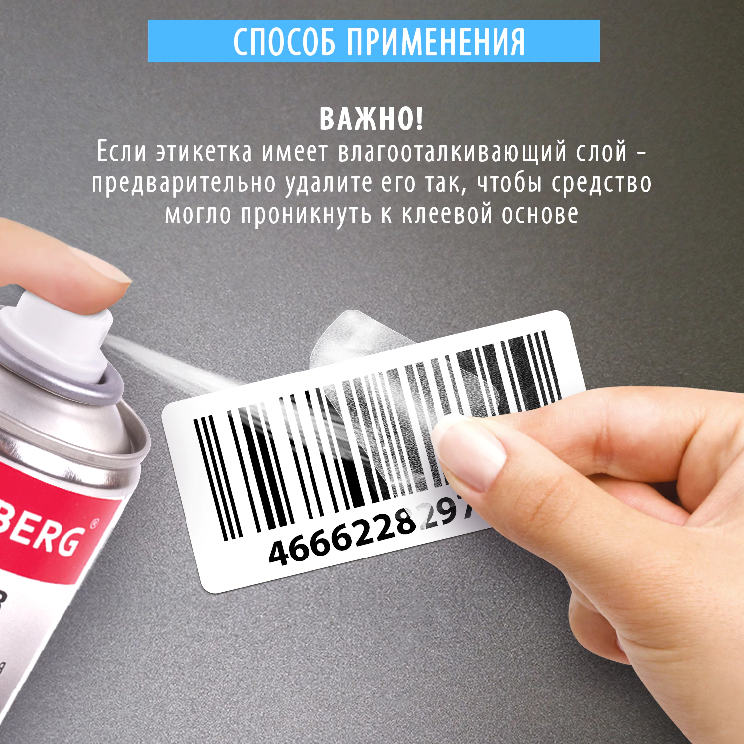 • Если этикетка имеет влагоотталкивающий слой - предварительно удалите его так, чтобы средство могло проникнуть к клеевой основе.