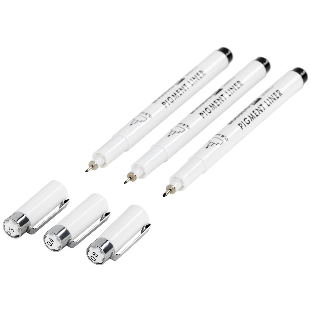 В наборе 3 черных капиллярных ручки с типом наконечника "Линер": № 0.3, 0.4, 0.8. Номер ручки на колпачке соответствует толщине линии письма в миллиметрах. Изготовлены с применением высококачественных чернил и наконечников. Чернила на водной основе, без кислот. Отличаются высокой светостойкостью и устойчивостью к воздействию воды. Подходят для работы в различных художественных техниках, каллиграфии и леттеринга.
