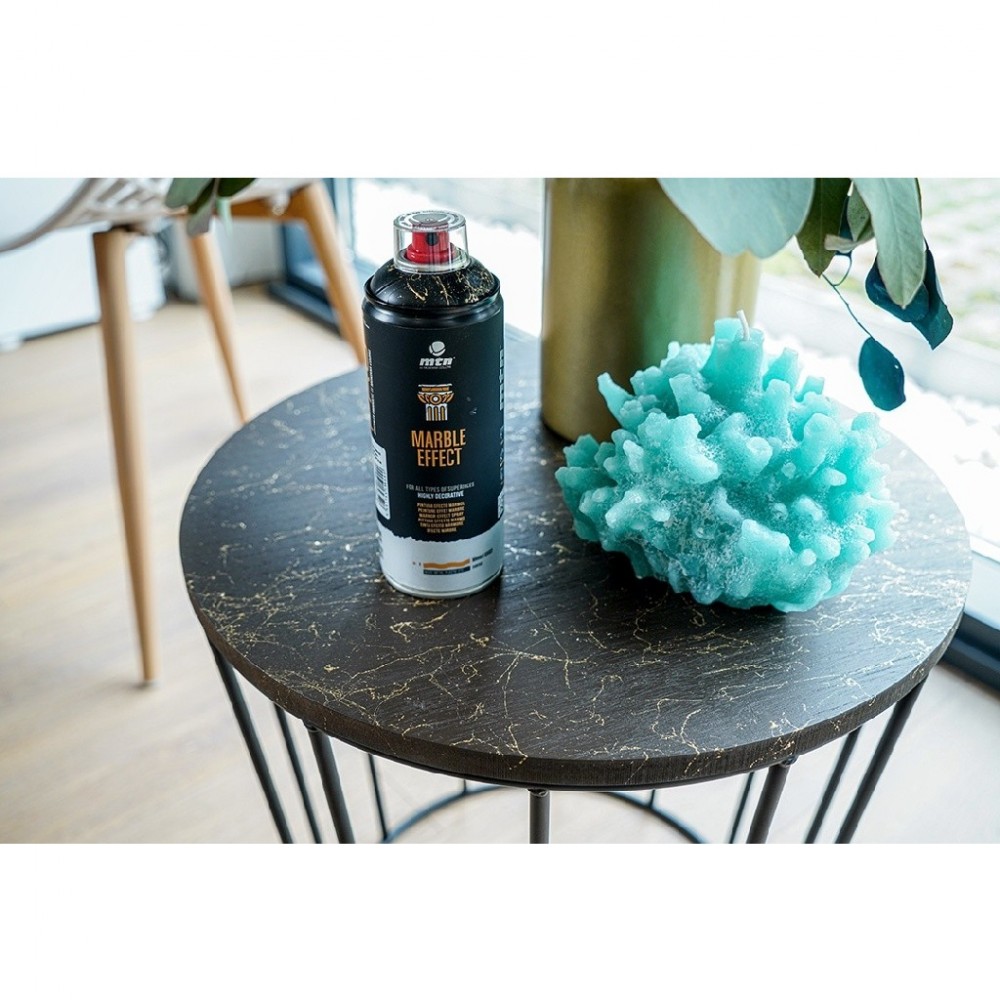 MTN PRO Marble Effect — декоративная аэрозольная краска на основе акрилового растворителя, которая придает мраморный вид всем типам поверхностей. Благодаря своим характеристикам его можно наносить на металл, большинство пластиков, камень, керамику, стекло и другие предварительно окрашенные поверхности. Краска обладает превосходной укрывистостью и растекается по поверхности тонкими нитями цветного лака, имитируя «прожилки» мрамора. Для улучшения адгезии рекомендуем нанести специальную грунтовку в зависимости от поверхности. Этот продукт идеально подходит как для внутренних, так и для наружных проектов; в последнем случае рекомендуется использовать акриловый лак MTN PRO для повышения его стойкости.