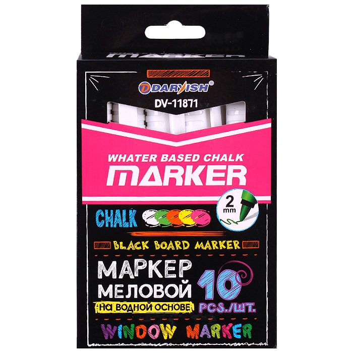 Маркер меловой на водной основе белый. В составе этого маркера — жидкий мел, который стирается влажной салфеткой, как обычный мел. Можно использовать на любой гладкой поверхности. Их используют учителя для надписей на школьных досках. Меловыми маркерами пользуются для оформления меню в барах и кафе. А кроме обычных меловых досок этим маркером можно рисовать на стекле.