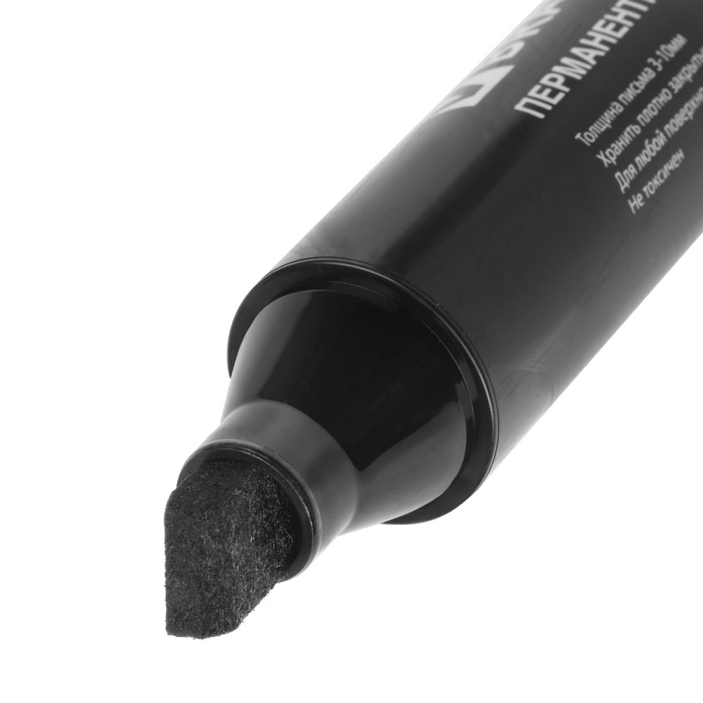 Маркер перманентный черного цвета обладает круглой формой корпуса из пластика, диаметр которого 26 мм. Толщина линии письма - 3-10 мм в зависимости от угла наклона. Особая нестираемая основа перманентного маркера обеспечивает такие качества, как стойкость к воздействию воды, ультрафиолета, низких и высоких температур. Благодаря спиртовой основе чернила быстро сохнут и не смазываются. Износостойкий фетровый наконечник устойчив к повреждениям и обеспечивает экономный расход чернил. Изделие не перезаправляется. Плотно закрывается колпачком, что предотвращает высыхание наконечника и чернил. Цвет корпуса и колпачка соответствует цвету чернил.