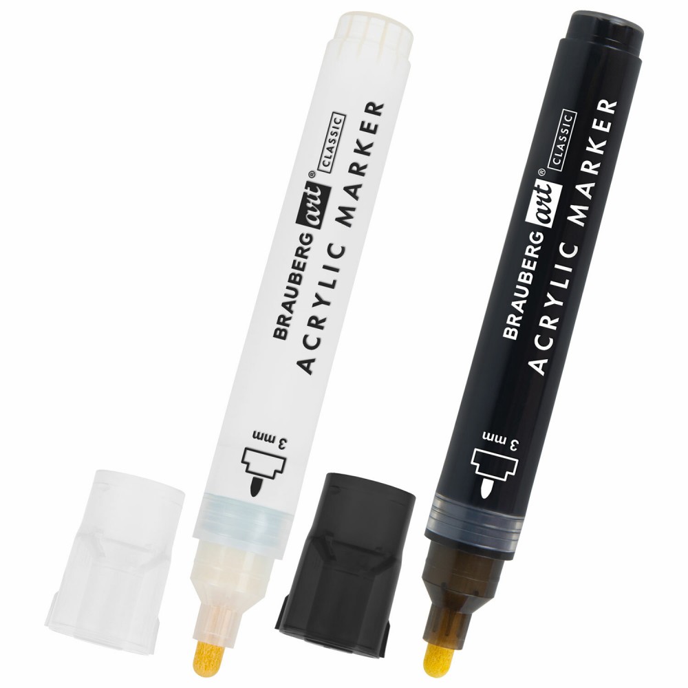 Акриловые маркеры с круглой формой корпуса из пластика. В комплекте 2 цвета. Толщина линии письма – 3 мм. Объем краски – 10 мл. Пигментированная акриловая краска на водной основе практически не имеет запаха, после высыхания обладает повышенной светостойкостью и водостойкостью.