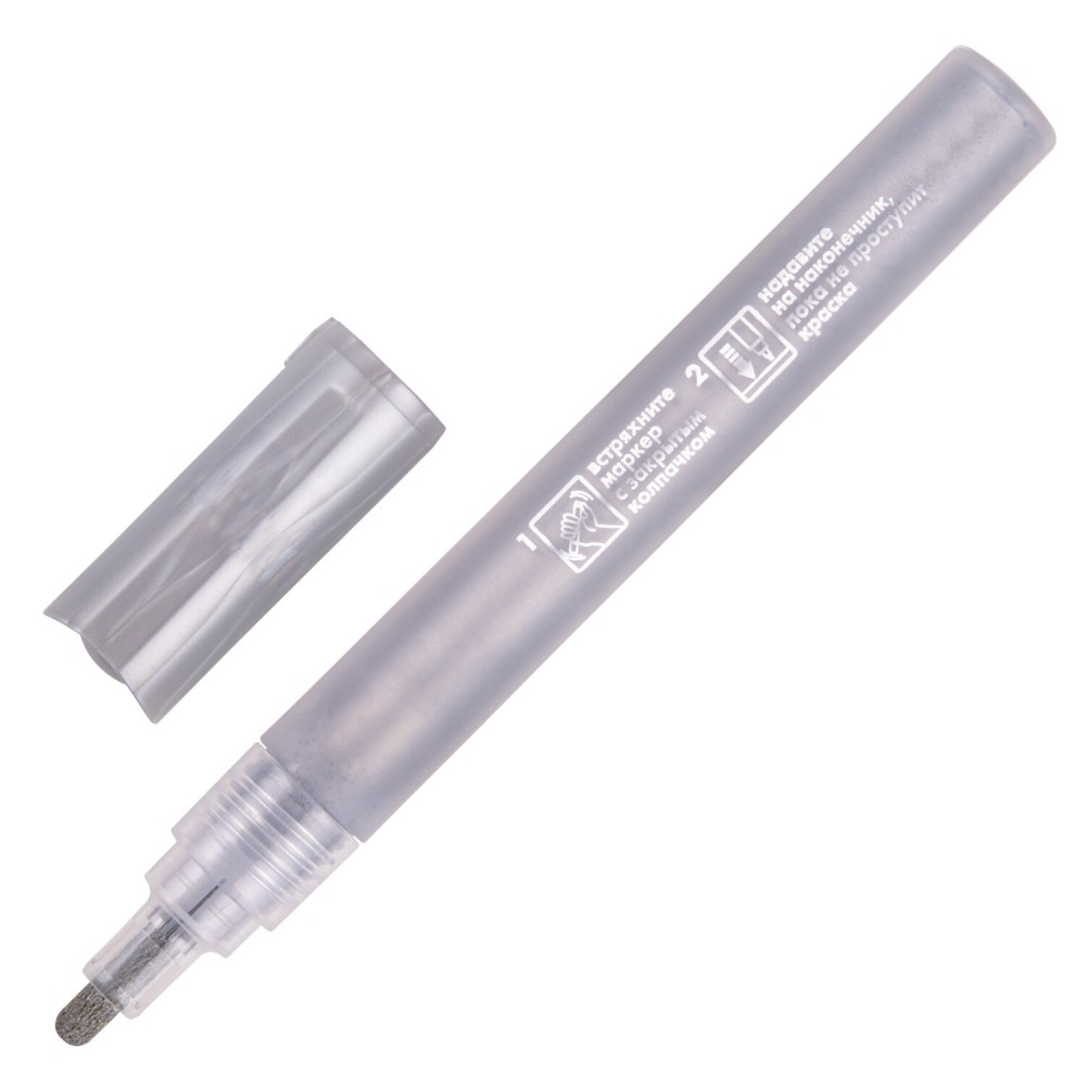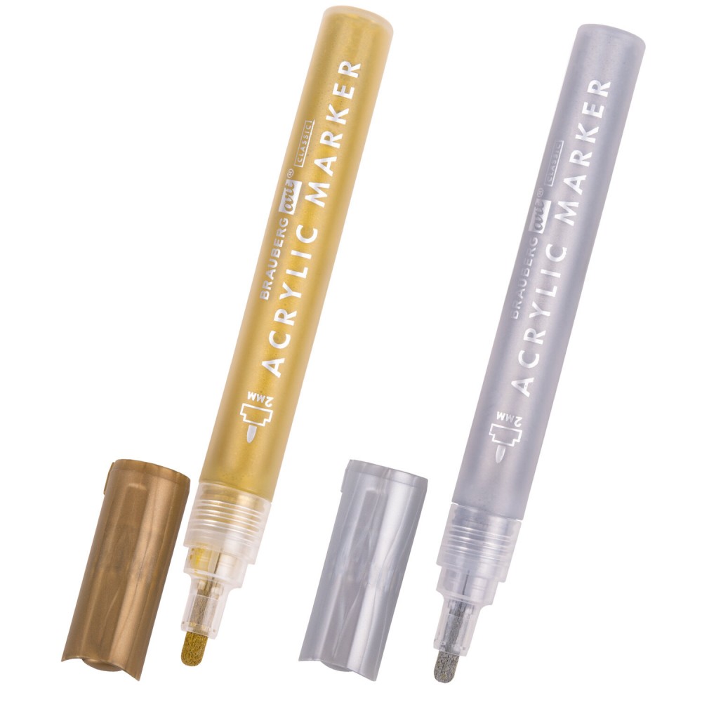 2 цвета в наборе: золотой и серебряный. Круглый пластиковый корпус, внутри которого находится металлический цилиндр для взбалтывания краски, имеет диаметр 18 мм. Пигментированная акриловая краска на водной основе практически не имеет запаха, после высыхания обладает повышенной светостойкостью и водостойкостью. Краска обладает превосходной укрывистостью. Благодаря водной основе краска быстро сохнет и не размазывается. Надежный помповый механизм подачи краски предотвращает вытекание и разбрызгивание в процессе использования, а также преждевременное высыхание. С помощью круглого прочного наконечника, выполненного из пористого акрила с шириной линии письма 2 мм, можно легко наносить линии средней толщины. Цвет корпуса и колпачка соответствует цвету краски.
