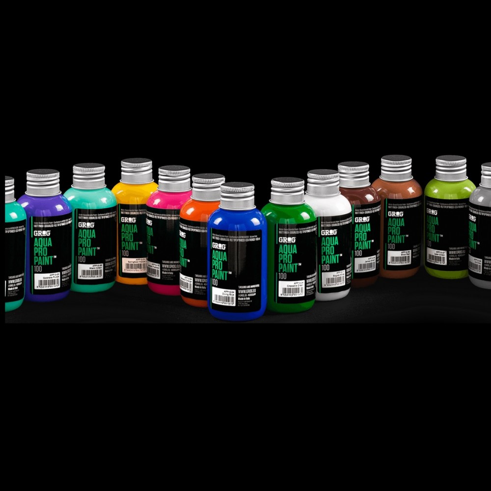 AQUA PRO PAINT 100 высокопигментированная акриловая краска на водной основе, оптимизированная для любых маркеров ,также можно использовать с кистями или аэрографом. Если вам нужна стойкая к атмосферным воздействиям, супер непрозрачная и глубоко матовая формула, это для вас. Идеально подходит как для пористых, так и для непористых материалов, прекрасно работает на темных поверхностях.